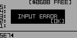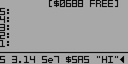 This is a simulation of a Forth-based graphing calculator running on a 6507 microprocessor, which is a derivative of the 6502. The calculator has an 8 level stack. Unlike most Forths, stack items can be one of four types: 64-bit decimal floating point, 16-bit hexadecimal number, 16-bit garbage collected pointer, and strings up to 8 characters in length. The floating point numbers use decimal arithmetic and have 12 digits of precision with an exponent range of ±999.